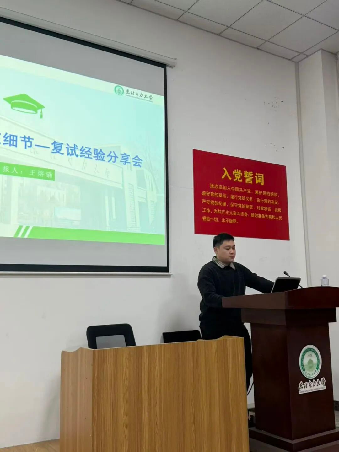 经验分享环节,自研第四党支部王熔镝同学以 “守好主场,赢在细节” 为主题开展考研复试经验分享,从复试心态、进度规划、复试流程、专业课笔试重点等方面细致讲解,还结合自身经验给出 “自信不自负、准备不焦虑” 的备考建议,为考研学子提供了针对性极强的复试指导。