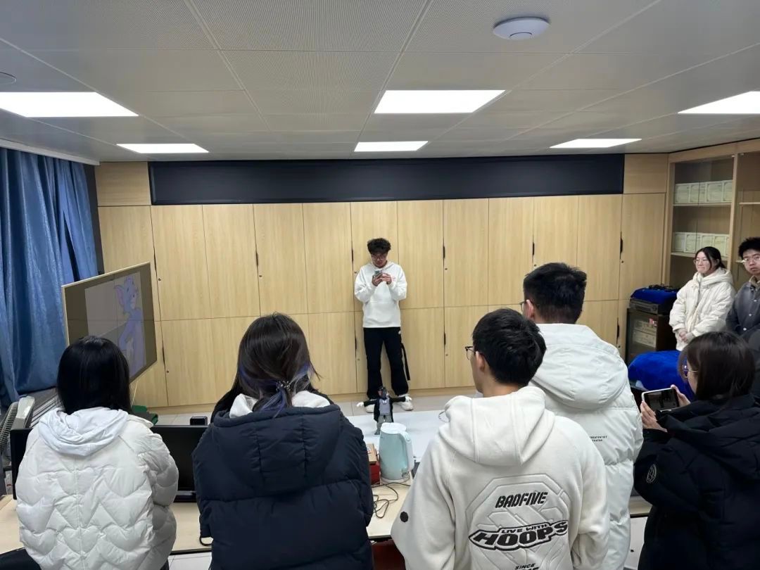 培训初始,实验室成员为新生呈现机器人表演示范。“三星堆机器人”以LED灯带勾勒青铜纹路,伴随《广寒宫》音乐,踏机械舞步、开合面具,尽显古蜀神秘。“青花瓷机器人”釉色机身随投影变换图案,在《青花瓷》伴奏下完成茶艺展示,尽显古韵。伴随着《小鳄鱼爱洗澡》的欢快视频,“小鳄鱼机器人”在泳池边踏着机械舞步,摆动着机械尾巴,尾巴尖划出水花四溅的弧线,仿佛在模仿鳄鱼潜泳的动作。同步登场的"汤姆猫机器人"则踩着《雨中曲》的爵士节拍,它的眼睛通过OLED屏幕展示出顽皮的眨眼和开心的微笑表情,与它的动作完美配合。