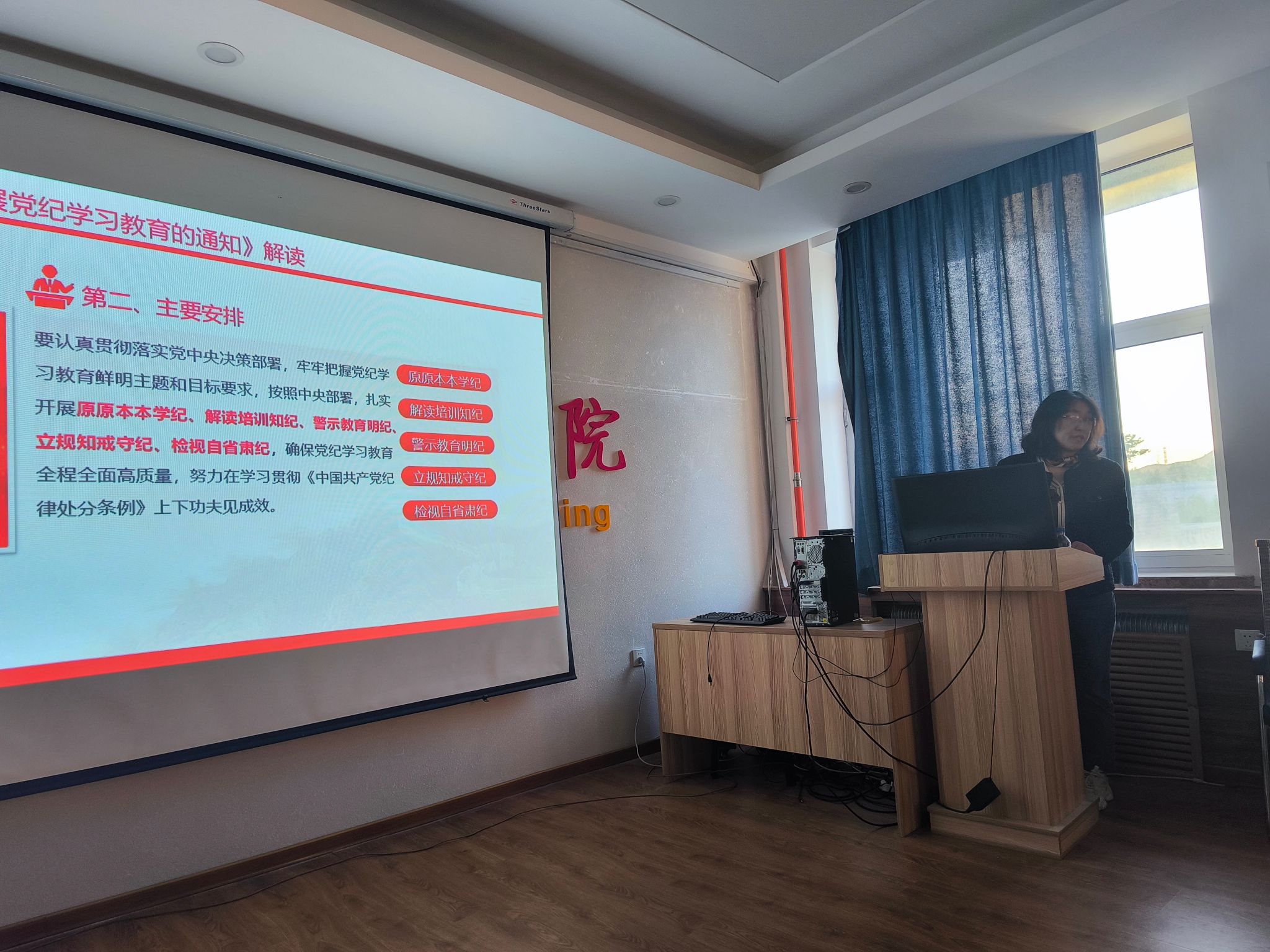姜文娟围绕“学纪、知纪、明纪、守纪”,从“党纪学习教育的通知解读”“重点内容学习导读”“让遵规守纪成为自觉行动”三个方面讲授党课,对《条例》的修订背景、主要内容和重要意义进行了介绍,教育引导师生党员深入学习和理解《条例》的内容要求,切实忠诚干净担当,以严明的纪律确保始终同以习近平同志为核心的党中央保持高度一致,做到统一思想、统一行动,知行知止、令行禁止。