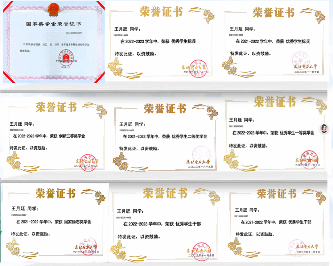 讲师团、助学团成员,获吉林市百优大学生、优秀学生标兵、优秀学生干部、优秀团员、优秀团干部等荣誉,曾获校长奖学金、国家奖学金、国家励志奖学金、特高压电网奖学金、优秀学生一等奖学金等奖学金,现已推免至东南大学攻读硕士学位。